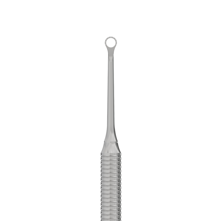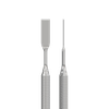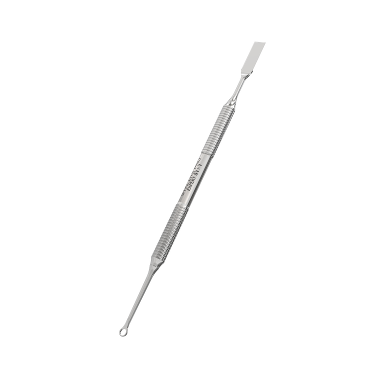 • ראש עבודה 2: טבעת - צד המעוצב בצורת לולאה (טבעת), מיועד להסרה בטוחה ועדינה של שאריות פטריגיום ועור דבוק ממשטח הציפורן, תוך מזעור הסיכון לפגיעה.