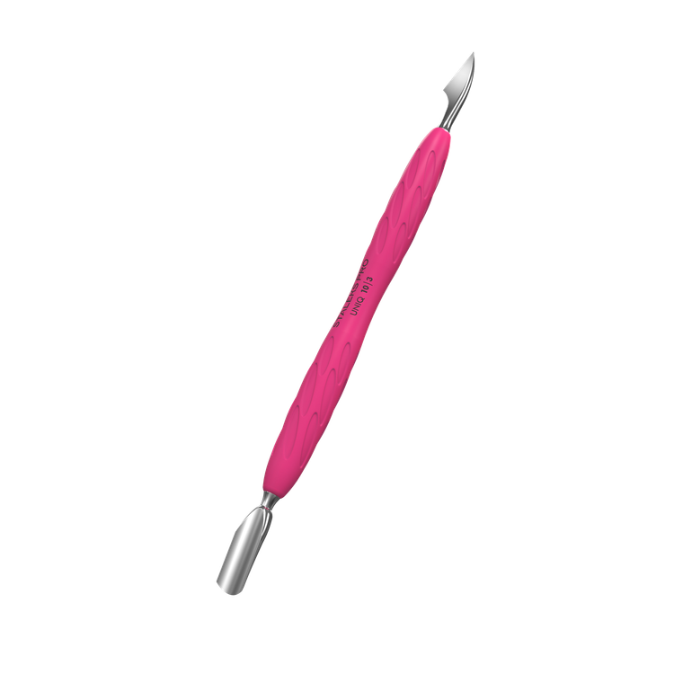 • ראש עבודה 1: דוחף מעוגל צר - בקימור התואם את צורת הציפורן, מיועד לדחיפה קלה ויעילה של הקוטיקולה לפני הסרתה.