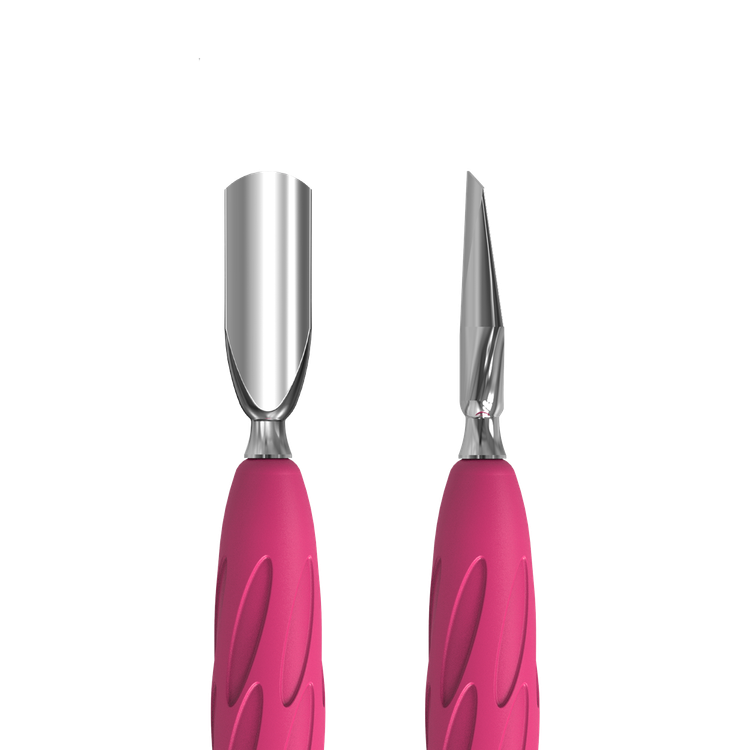 • ראש עבודה 1: דוחף מעוגל צר - בקימור התואם את צורת הציפורן, מיועד לדחיפה קלה ויעילה של הקוטיקולה לפני הסרתה.